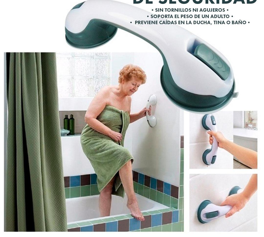 Barra de seguridad con ventosas Helping Handell se sujeta o adhiere a superficies planas y lizas como la pared en cer mica de tu ba o Ahora estar s m s seguro y tranquilo gracias a su cuerpo ergon mico que ofrece la mejor sujeci n en cualquier momento que se necesite Caracter sticas Material Pl stico Medidas 29 x 9 5 x 8 5 cm Peso en empaque 316 g Barra anti deslizante F cil de instalar y de quitar Sin tornillos ni agujeros Soporta el peso de un adulto Previene ca das en la ducha tina o ba o Ideal para ancianos ni os discapacitados y o personas con necesidades especiales Ergon mico de f cil agarre Seguridad en lugares resbalosos